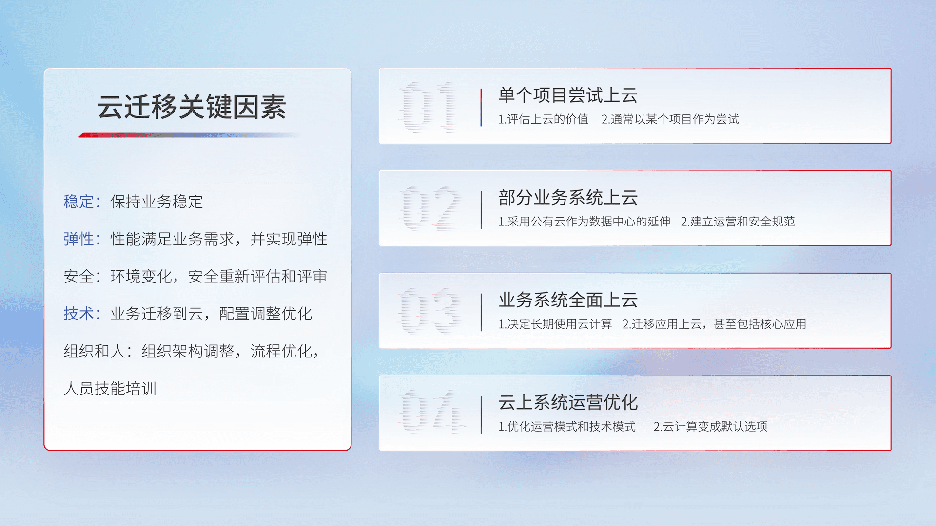 结合实际业务,,,,从规划设计、、云平台选型、、、、云原生改造、、、、数据迁移、、、集成交付,,迁移全过程为客户识别最佳上云路径,,,做好风险识别管理,,设计网络架构、、、、身份权限、、安全审计合规、、、、操作审计、、、、日志审计、、监控告警策略、、、多站点容灾设计等,,,,对云上基础设施进行整体规划,,,,提升IT治理水平,,,以满足弹性、、高可用、、、、高性能的需求。。